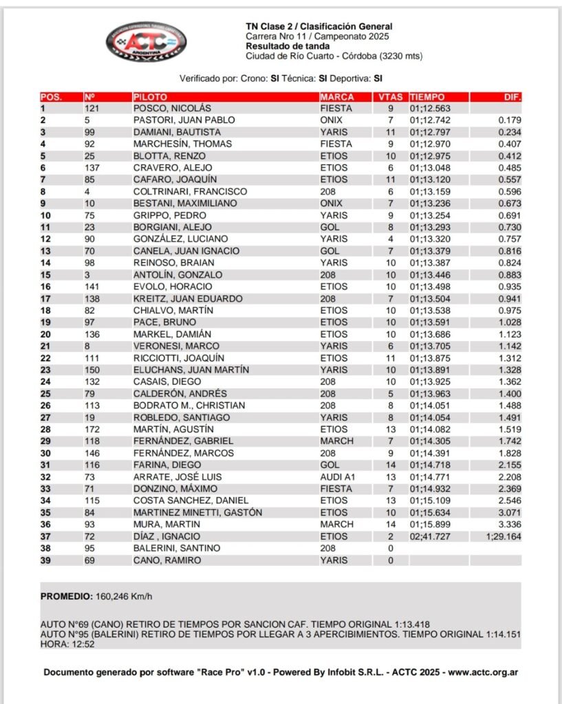 Posterior a la tanda, le fueron aplicados los correspondientes retiros de tiempos a los pilotos Ramiro Cano y Santino Balerini, por sanciones impuestas anteriormente por CAF-ACTC, debiendo largar en el último lugar de la serie que le corresponda. A las 14:30 horas, se disputarán las series clasificatorias.