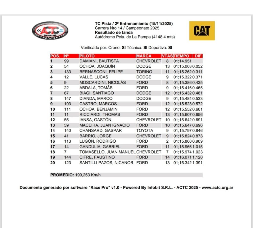 El tiempo para Damiani fue de 1:14.951 y lo hizo 52 milésimas más rápido que Joaquín Ochoa, que llegó en la segunda colocación, a bordo de un Dodge del SAP Team. Quien estuvo en la tercera colocación fue Felipe Bernasconi, a una diferencia de 311/1000, con el Torino del Trotta Competición.