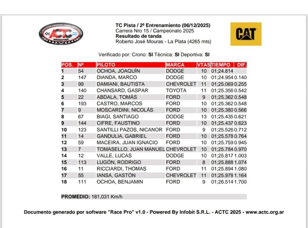 El TC Pista disputó su segundo entrenamiento en el Autódromo Roberto Mouras de La Plata. En la mañana, el más veloz fue Joaquín Ochoa y ahora el piloto de Viedma volvió a repetir lo hecho en la práctica matutina para adueñarse de ambas sesiones.