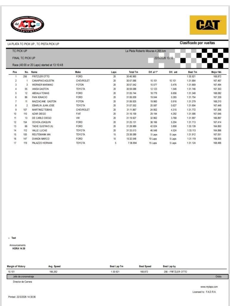 Al final, Fritzler ganó con una holgura de 10 segundos, y fue el único que bajo del 1m31s, con un record de vuelta de 1m30s921/1000. Detrás suyo quedaron Canapino y Werner. El top 5 lo rellenaron Gastón Iansa con la Toyota del Magnoluz Racing, de gran tarea, y Tomás Abdala, con la Ranger de su propia estructura.