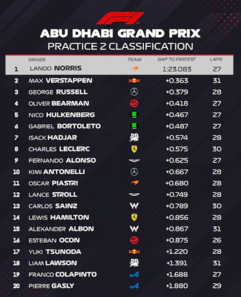 La Fórmula 1 completó su primer día de actividad en el Gran Premio de Abu Dhabi. Lando Norris, máximo candidato al título, quedó en la cima en ambos ensayos: lideró la FP1 con un tiempo de 1:24.485 y la FP2 con una marca de 1:23.083. Max Verstappen, otro de los contendientes, se ubicó por detrás en las dos tandas. Oscar Piastri, que mantiene vivas sus expectativas de salir campeón, terminó 11° en la práctica nocturna.