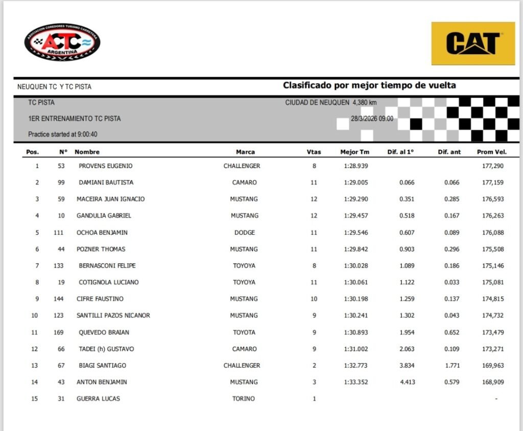 Eugenio Provens, con el Dodge Challenger del Galarza Racing, marcó un 1m28s939/1000 y se adueñó del primer entrenamiento del TC Pista en el Autódromo Provincia del Neuquén, en lo que fue el arranque de la fecha 3 de la categoría telonera. Segundo terminó el líder del campeonato Bautista Damiani con el Chevrolet Camaro del Canning Motorsports a 66 milésimas y completó el podio el Ford Mustang de Juan Ignacio Maceira, que alista el Catalan Magni Motorsport, a 351 milésimas.