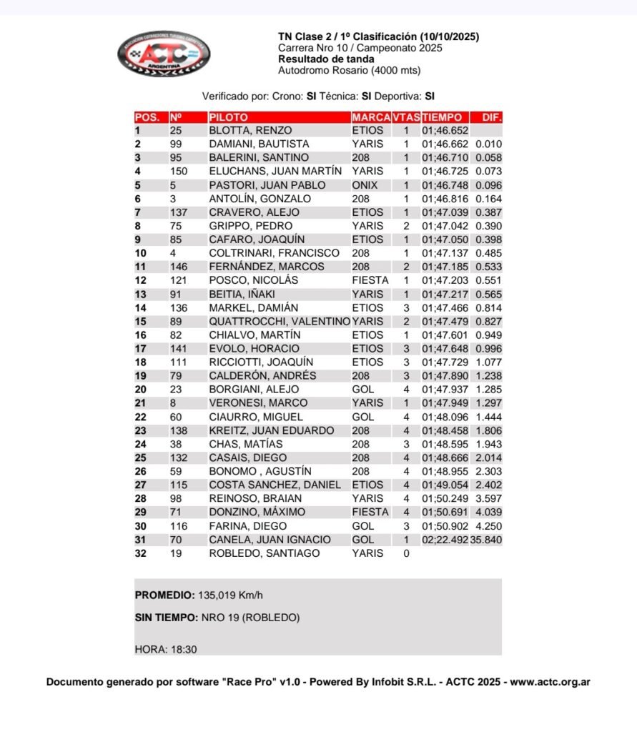 En tanto, el líder del Campeonato 2025 Río Uruguay Seguros, Francisco Coltrinari, completó el desarrollo clasificatorio en la décima posición a bordo del Peugeot 208 atendido por Saturni Racing. Desde las 11:00 horas del día de mañana, con transmisión en vivo por DeporTV, Renzo Blotta intentará validar su condición de poleman provisional en la segunda tanda, buscando su primera pole position en la presente temporada.