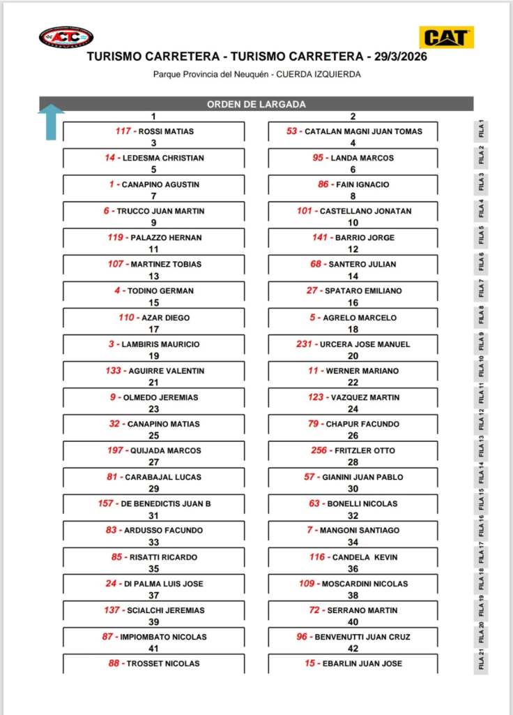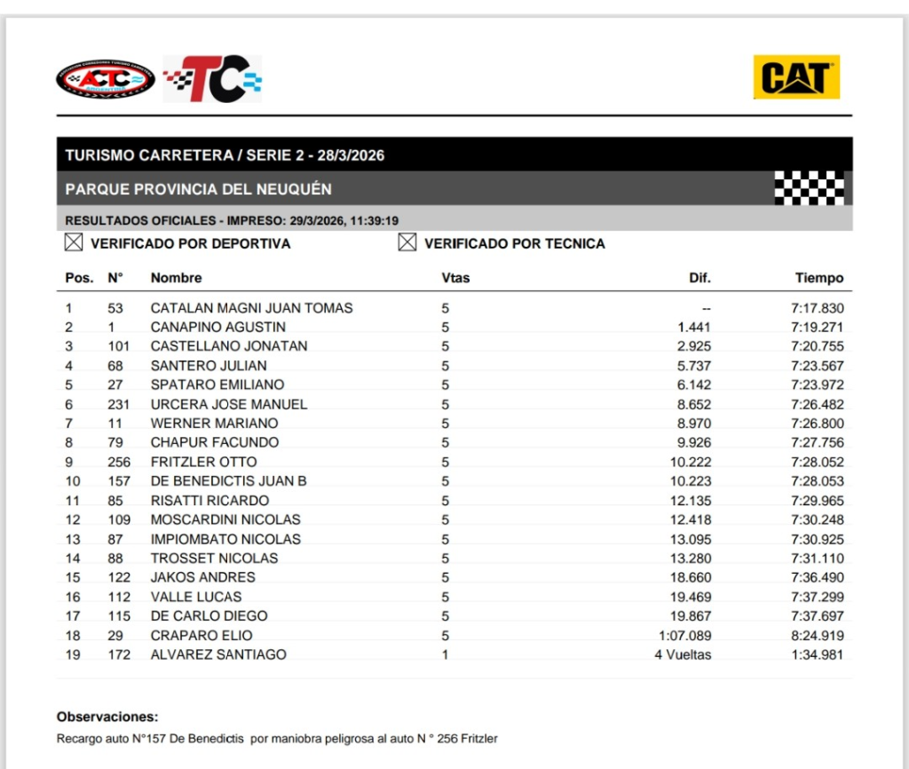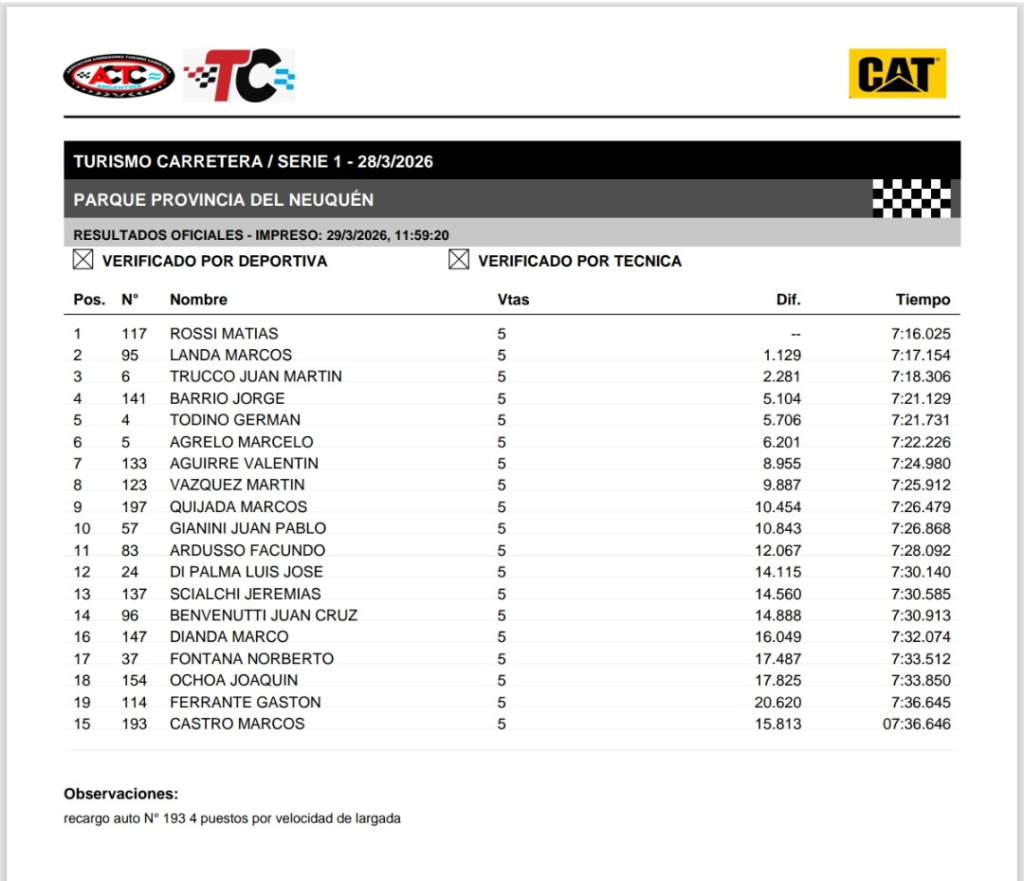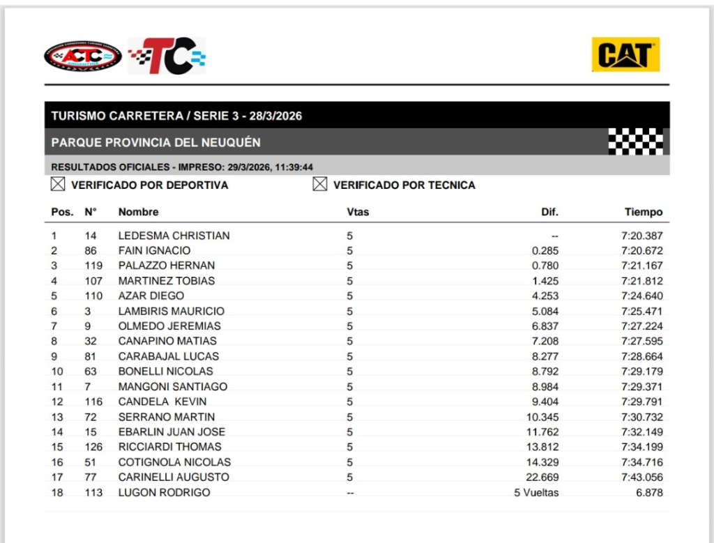 En el Autódromo Provincia del Neuquén por la tercera fecha del Turismo Carretera, Matías Rossi volvió a dominar con el Toyota Camry del Pradecon Racing y ganó la primera serie, que fue la más rápida; la segunda más veloz se la llevó Juan Tomás Catalan Magni, con el Camry del Azar Motorsport; y la tercera y más lenta, fue para Christian Ledesma con el Chevrolet Camaro del Pradecon. En la fila uno de la final estarán Rossi y Catalan Magni, y desde atrás parte Ledesma.