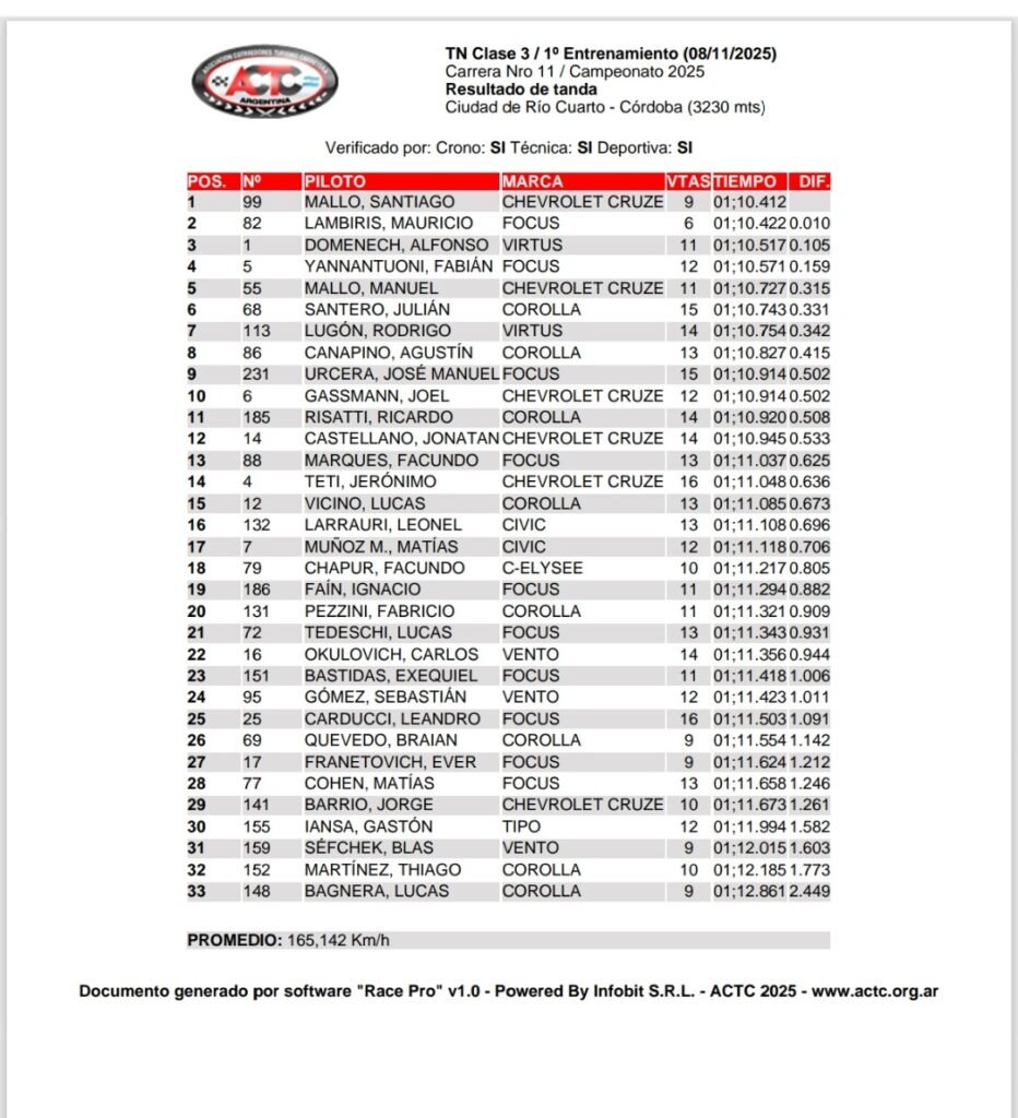 Santiago Mallo logró el mejor tiempo al cabo de la primera tanda de entrenamientos que TN Clase 3 disputó en el Autódromo Ciudad de Río Cuarto, donde comenzó el primer día de actividad en el marco del Gran Premio Gobierno de la Provincia de Córdoba – Copa Vittal para la divisional que hoy clasificará en horas de la tarde de hoy.