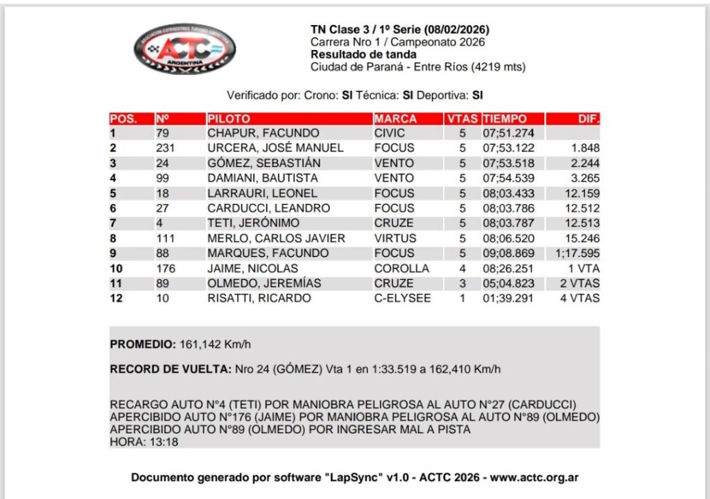 Facundo Chapur continúa con su racha vencedor en el Autódromo Ciudad de Paraná (Entre Ríos), ahora ganando la primera serie diputada en horas de la mañana de hoy en el escenario administrado por el Club De Volantes Entrerrianos, donde hoy finalizará la primera fecha del Campeonato 2026.