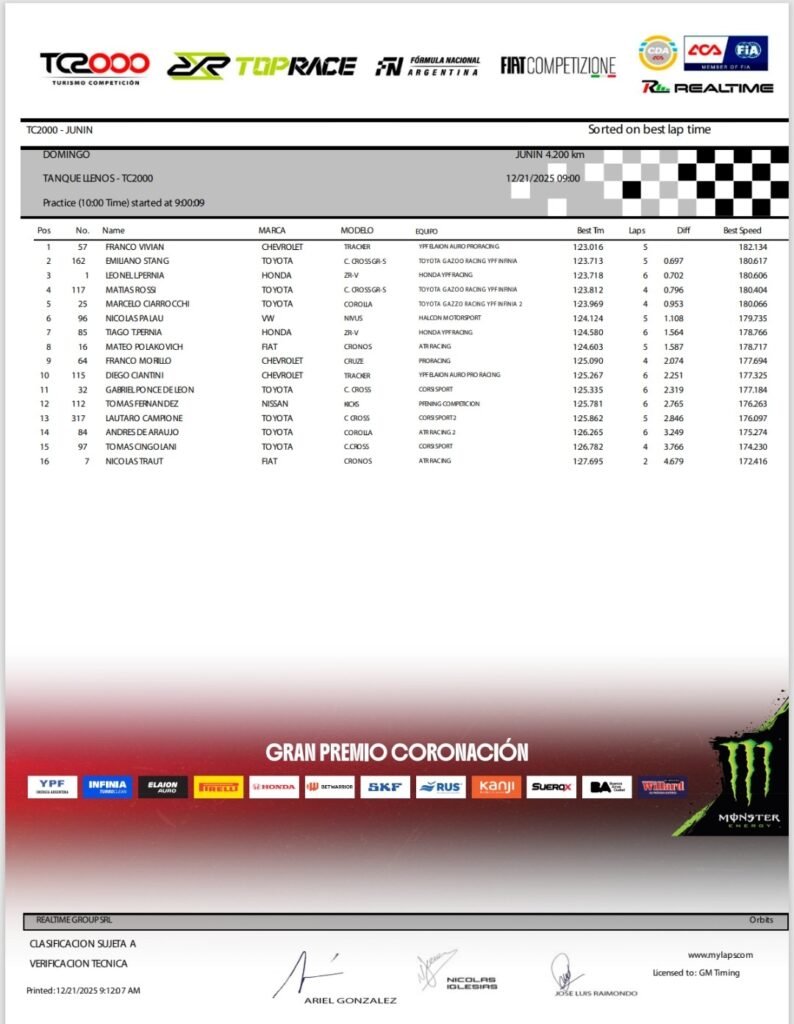 Comenzó la actividad del domingo para la 12º fecha del 46º Campeonato Argentino de TC2000 YPF INFINIA en el Autódromo “Eusebio Marcilla” de Junín, epicentro del “Gran Premio Coronación 2025”, con la prueba de tanques llenos. Franco Vivian con la Chevrolet Tracker #57 del YPF ELAION AURO Proracing se quedó con el mejor tiempo tras marcar 1m23s016/1000 a una velocidad promedio 182,134 km/h.