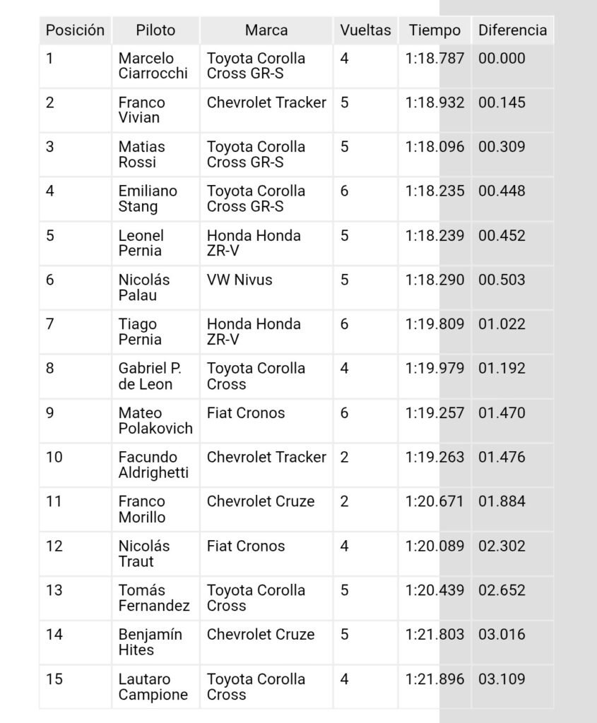 Nicolás Palau (VW Nivus #96 – Halcón Motorsport), Tiago Pernía (Honda ZR-V #85 – Honda YPF Racing), Gabriel Ponce de León (Toyota Corolla Cross #32 – Corsi Sport), Mateo Polakovich (Fiat Cronos #16 – ATR Racing) y Facundo Aldrighetti (Chevrolet Tracker #83 – YPF ELAION AURO Proracing) fueron los pilotos que cerraron los diez mejores de la mañana.