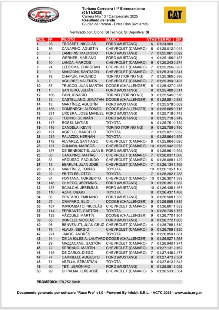 Nicolás Trosett, con el Ford Mustang que le atiende el equipo MV Racing se quedó con el mejor tiempo de vuelta del primer entrenamiento del Turismo Carretera, que cumple la 13ª. fecha del calendario, en el autódromo de la ciudad de Paraná, Entre Rios.