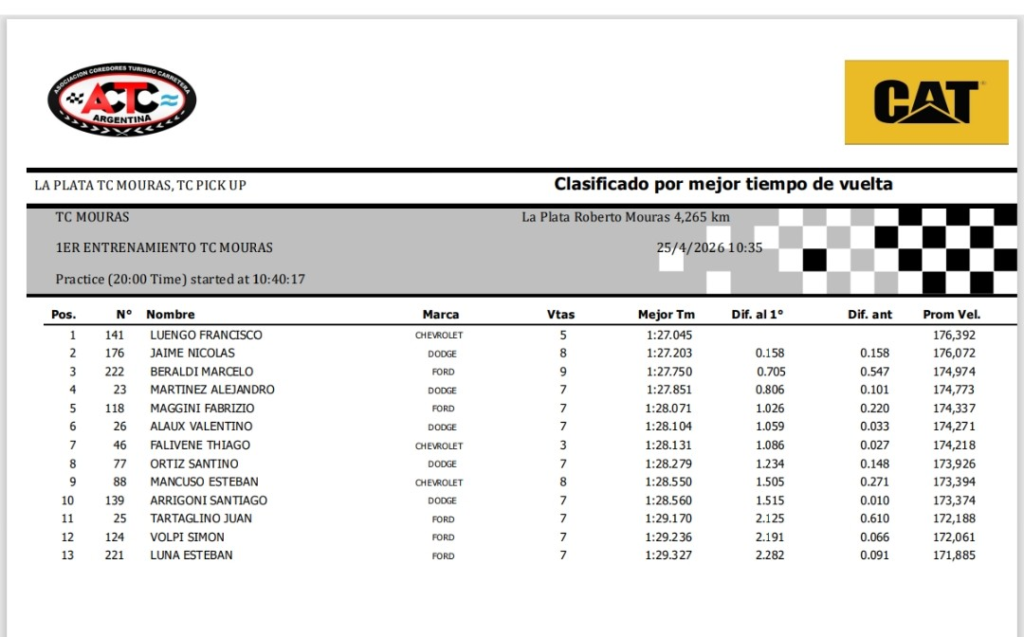 1:27.045 registró el Chevrolet N°141 de Luengo, que lo hizo 158 milésimas más rápido que Nicolás Jaime, puntero del campeonato, que tripula un Dodge del Galarza Racing. Marcelo Beraldi, por su parte, ocupó la tercera ubicación, con el Ford del Tomás Abdala Competición, a una distancia de 705/1000.