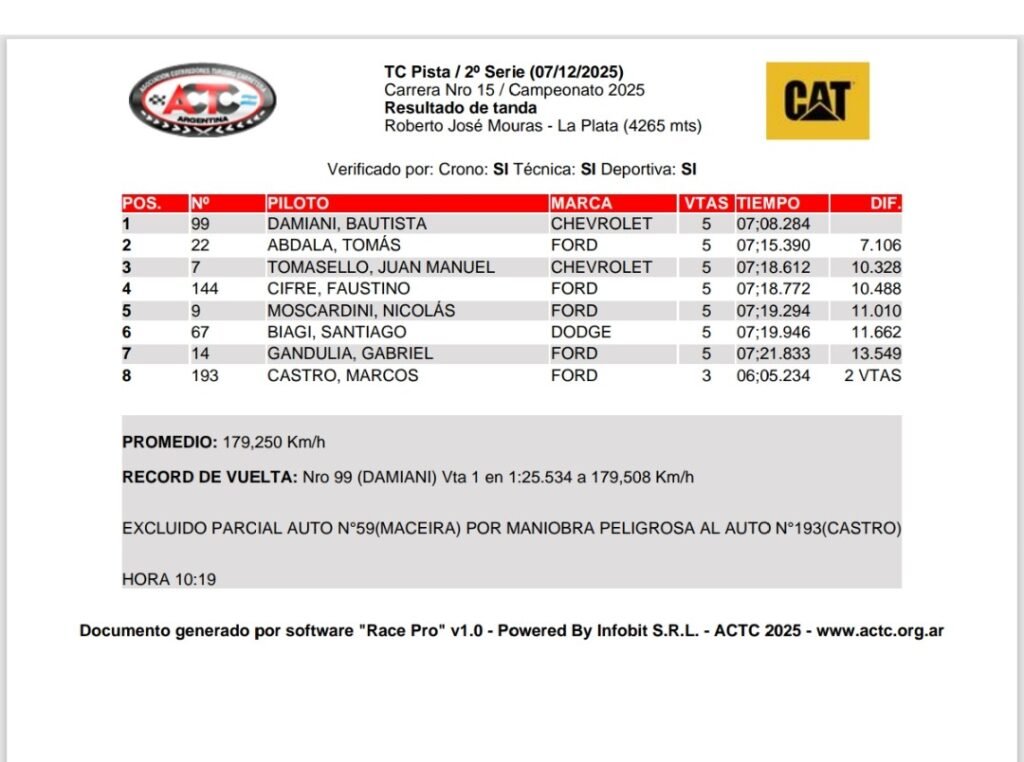 Bautista Damiani (Chevrolet) y Gastón Iansa (Chevrolet) resultaron los ganadores de las series de la 15ª y última fecha del campeonato 2025 del TC Pista, que tiene como escenario el autódromo “Roberto Mouras” de La Plata. Los pilotos del Canning Motorsports compartirán la 1ª fila de la Final, en la que la cuerda será para el flamante campeón del TN Clase 2 por 2ª vez en la temporada, ya que su batería resultó 0s475 más veloz.
