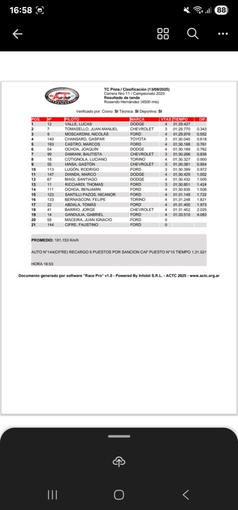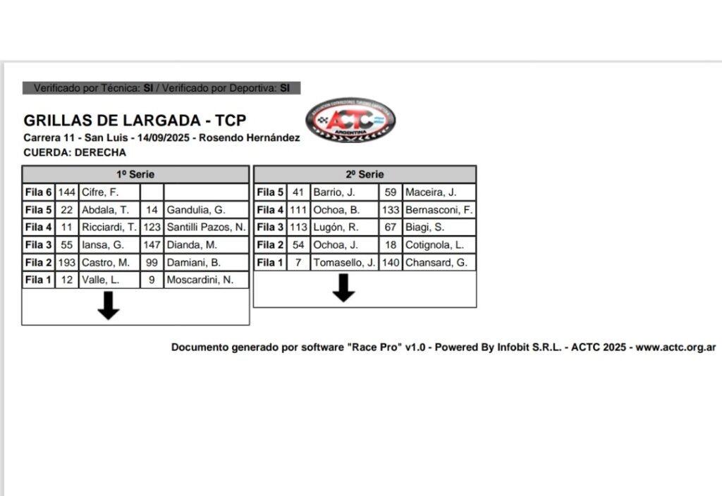 Terminó la actividad en pista para el TC Pista por este caluroso sábado. Mañana, a partir de las 09:15 horas, se largarán las series que determinarán el ordenamiento de la grilla final de la 11° fecha en San Luis.