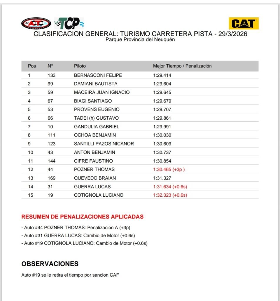 Felipe Bernasconi, piloto del JMB Competición, se quedó con la Pole CAT del sábado de TC Pista en Neuquén, cuando registró un 1m29s414/1000 a bordo del Toyota Camry, y largará adelante de todos en la primera serie del domingo. Segundo se ubicó Bautista Damiani a 190 milésimas con el Chevrolet Camaro del Canning Motorsports y el tercer lugar fue para Juan Ignacio Maceira, con el Ford Mustang del Catalan Magni Motorsport.