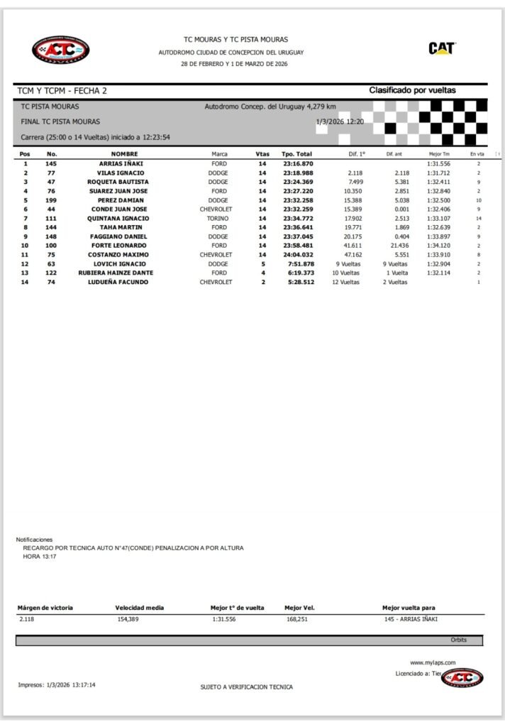 1° Arrías, con el mismo Ford que utilizó el año pasado y bajo la misma estructura. En la segunda colocación llegó Vilas, con el Dodge del Galarza Racing, a una diferencia de 2.118 milésimas. Bautista Roqueta se subió al último escalón del podio, con el Dodge del Canning Motorsport, a una distancia de 7.499/1000.