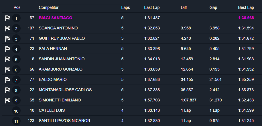 “Fue una serie bastante peleada al principio, siempre respetándonos. Después cometió un error y perdió la camioneta. A partir de ahí traté de hacer la serie lo más rápida posible, aunque las dos primeras vueltas fueron algo lentas por la pelea y porque tuve que levantar ante el despiste de Nicanor (Santilli Pazos). Lo bueno es que pudimos sacar la falla que tuvimos ayer”, sostuvo Biagi en Campeones Radio y AM590 Continental.