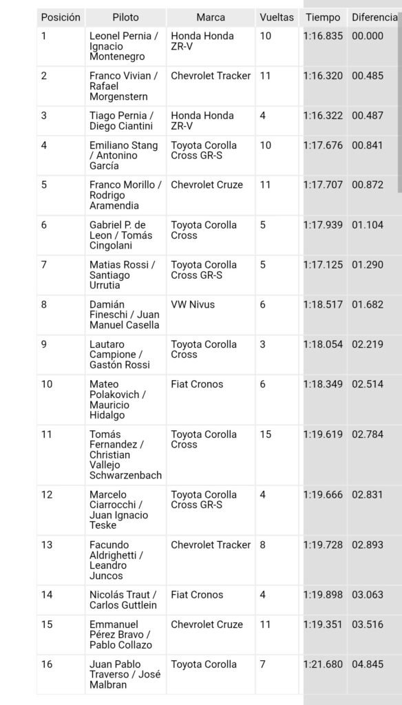 Gabriel Ponce de León-Tomás Cingolani (Corsi Sport), Matías Rossi-Santiago Urrutia (Toyota Gazoo Racing YPF INFINIA), Damián Fineschi-Juan Manuel Casella (Halcón Motorsport), Lautaro Campione-Gastón Rossi (Corsi Sport 2) y Mateo Polakovich-Mauricio Hidalgo (ATR Racing) completaron los diez mejores.