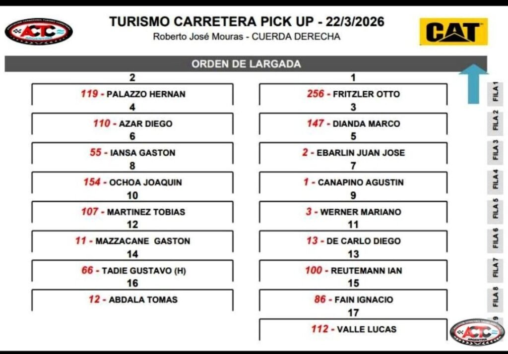 La final del Gran Premio Lusqtoff será a las 13:10 horas y se podrá ver por la pantalla de El Nueve y Motor Play. En la fila uno arrancan Fritzler y Palazzo; en la segunda Dianda y Azar; en la tercera estarán Ebarlín e Iansa, y en la cuarta Canapino y Ochoa.