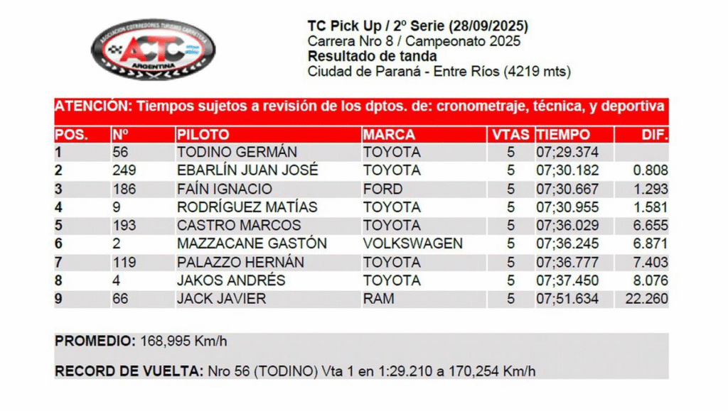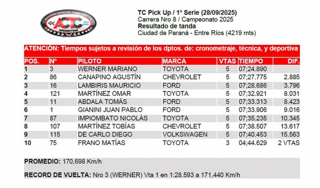 El local Mariano Werner con su Toyota Hilux ganó la serie más rápida y largará desde la ‘pole’ en la final del TC Pick Up que disputa su 8ª Fecha en el Autódromo Ciudad de Paraná -4.219 mts.-. Detrás suyo, quedaron Agustín Canapino de Chevrolet y Mauricio Lambiris de Ford. Germán Todino, con otra Hilux, se quedó con la otra batería -que fue 5s más lenta-, superando a Juan José Ebarlín -Toyota- e Ignacio Faín, y acompañará al paranaense en la primer fila de la final.