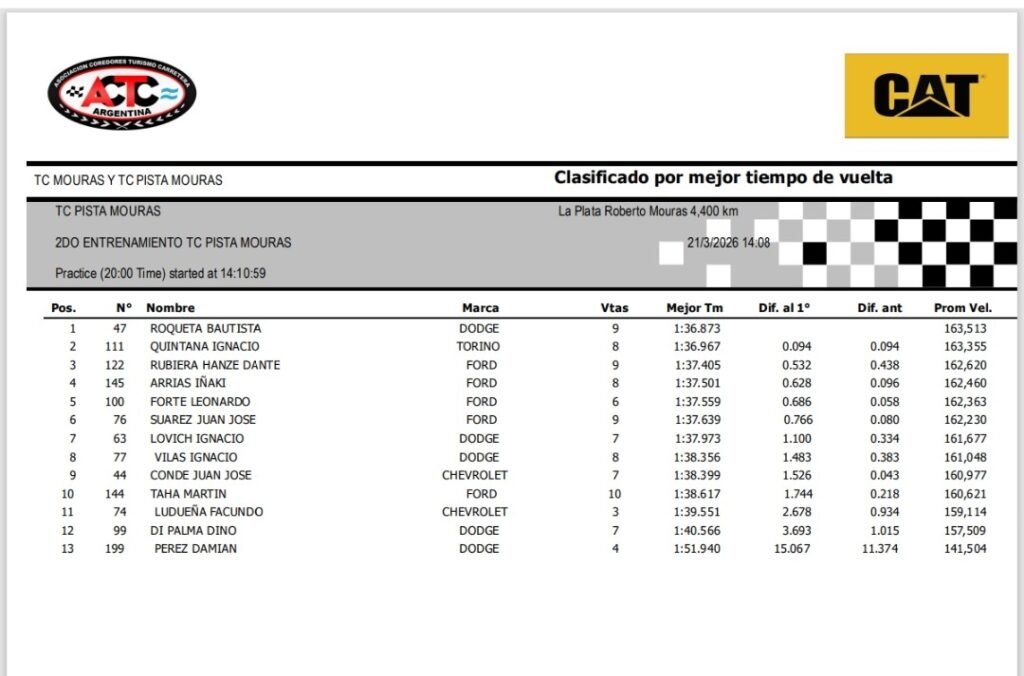Bautista Roqueta, que tripula un Dodge del Canning Motorsport, se llevó el segundo entrenamiento del TC Pista Mouras, en un sábado nublado, con un cielo que amenaza con llover. Éste significó la última práctica de la fecha, previo a la clasificación general.