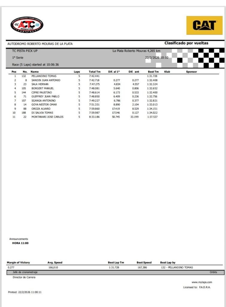 Detrás llegaron 3° Hernán Sala (Dodge RAM-Fadel Memo Corse); 4° Manuel Borgert (Ford Ranger- Magnoluz Racing) y 5° Faustino Cifre (Ford Ranger- Giavedoni Sport).