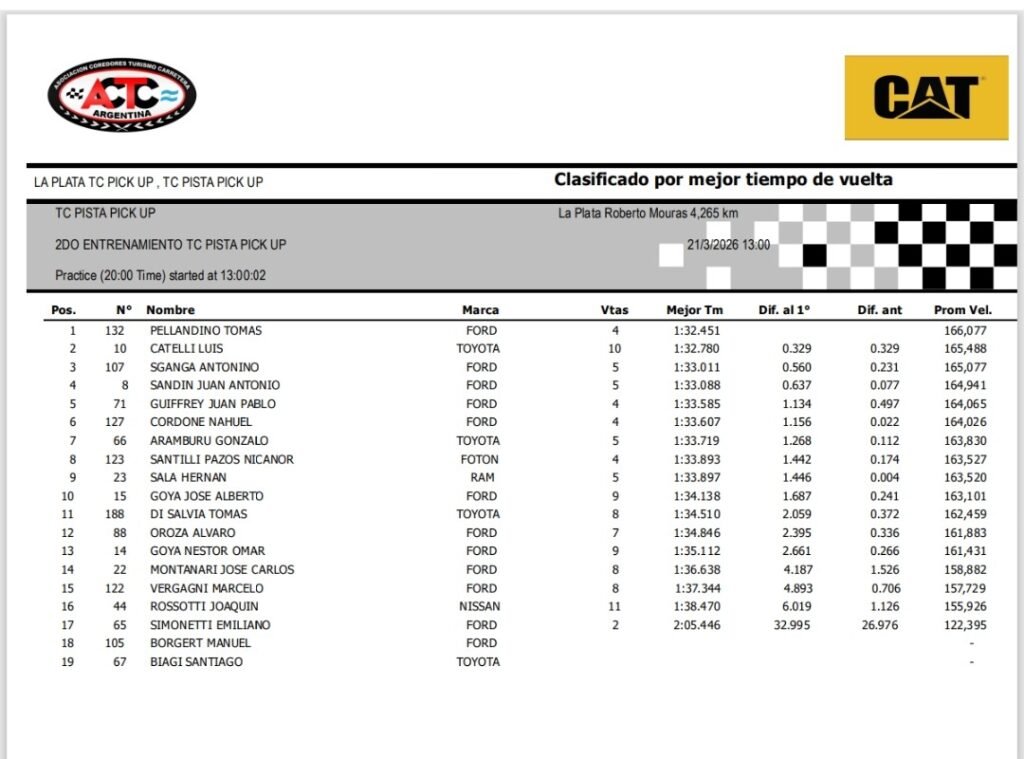 Los entrenamientos de las TC Pista Pick Up terminaron, y el segundo se lo llevó Tomás Pellandino, a bordo de la Ford Ranger del SAP Team con un tiempo de 1m32s451/1000. Atrás quedaron Luis Catelli, con la Toyota Hilux del Matías Jalaf Competición a 329 milésimas, y Antonino Sganga, también con Toyota, pero del Azar Motorsports a 5 décimas.