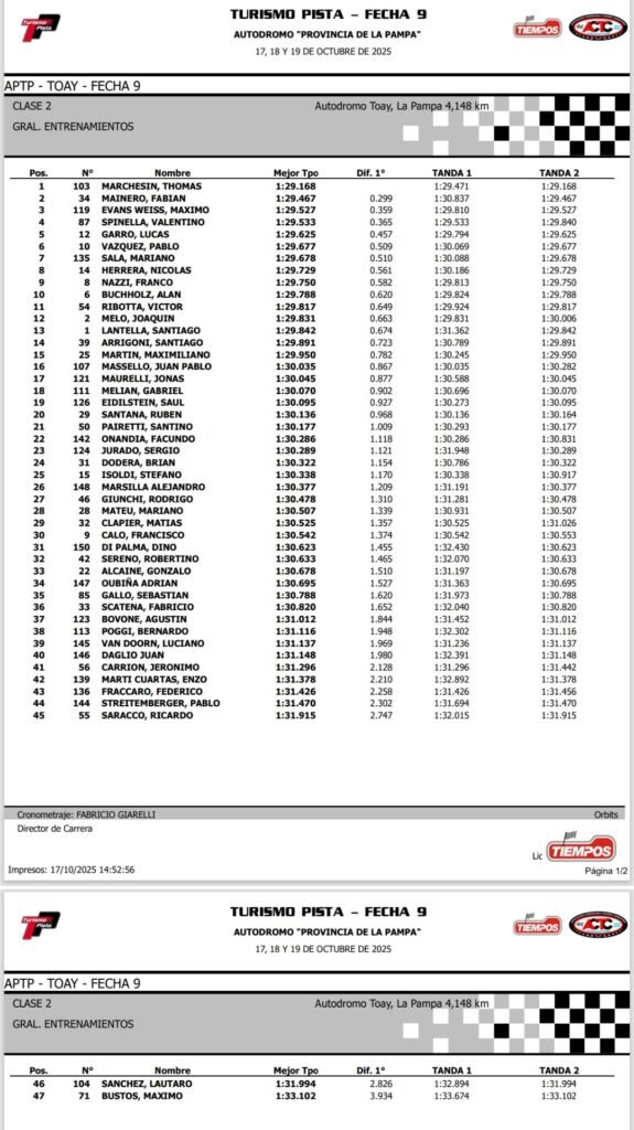 Marchesin se mostró firme desde el comienzo de las acciones y se impuso en las dos salidas para quedar al frente de la general con un tiempo de 1:29.168. El piloto de Quilmes relegó por 299 milésimas a Mainero y por 359 a Evans Weiss, mientras que Valentino Spinella se metió cuarto, a 365 y Lucas Garro cerró el top cinco, a 457.