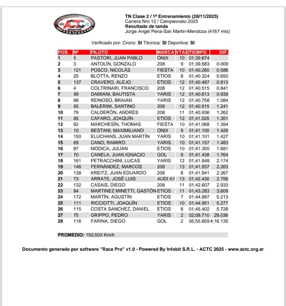 Juan Pablo Pastori dominó la primera tanda de entrenamientos disputada por el TN Clase 2 en el Autódromo Ciudad de San Martín (Mendoza), donde comenzó la definición del Campeonato 2025 Río Uruguay Seguros, en el marco del Gran Premio Olca Rental. El piloto misionero cronometró 1m39s674 para superar por apenas 0s009 a Gonzalo Antolín, líder de la tabla anual.