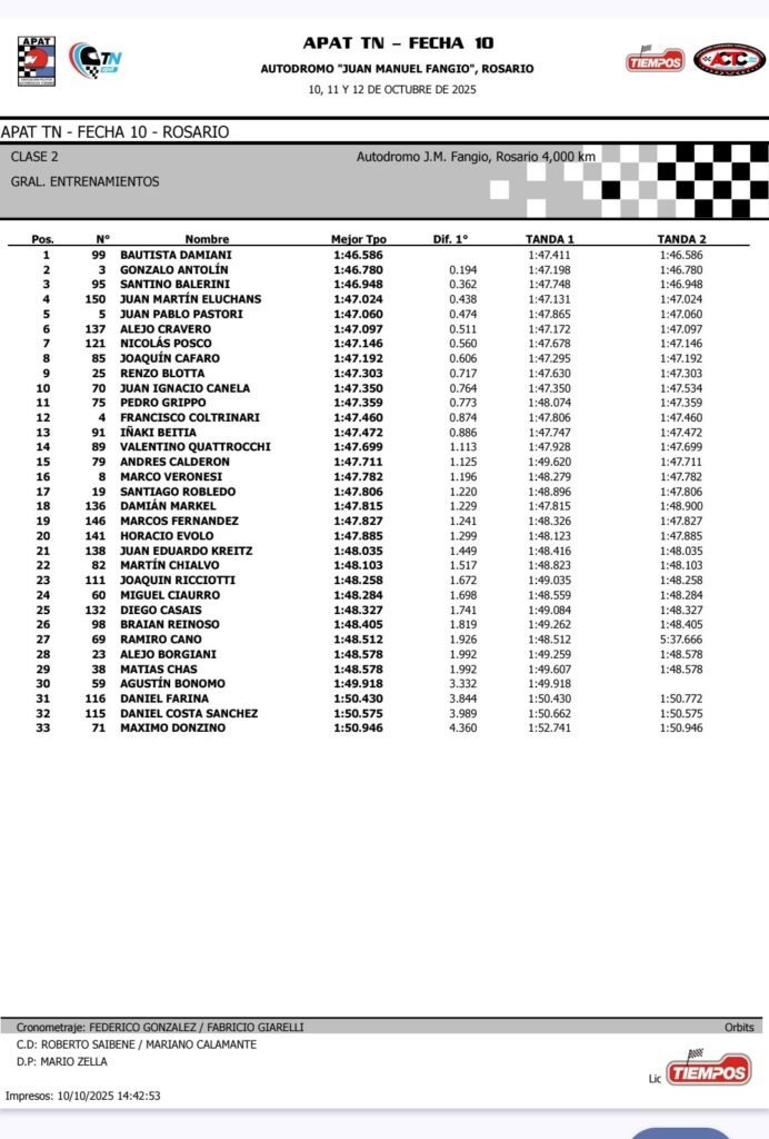 Cronometrando 1m46s586, el actual subcampeón de TN Clase 2 superó por 0s194 a Gonzalo Antolín y por 0s362 a Santino Balerini, siendo de momento el piloto provincial mejor ubicado en los entrenamientos generales. Juan Martín Eluchans, quien había dominado la primera tanda cronometrada, y Juan Pablo Pastori, cronometraron las principales posiciones.