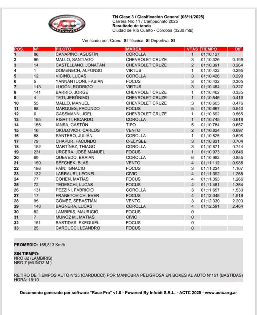 En su segunda carrera como piloto titular en TN Clase 3, Agustìn Canapino logró la pole position a los mandos del Toyota Corolla atendido por Ale Bucci Racing, formación que logra su segunda vuelta veloz en el Campeonato 2025 Río Uruguay Seguros, que tendrá en el día de mañana el desarrollo de tres series y de la prueba final en el Autódromo Ciudad de Río Cuarto (Córdoba).
