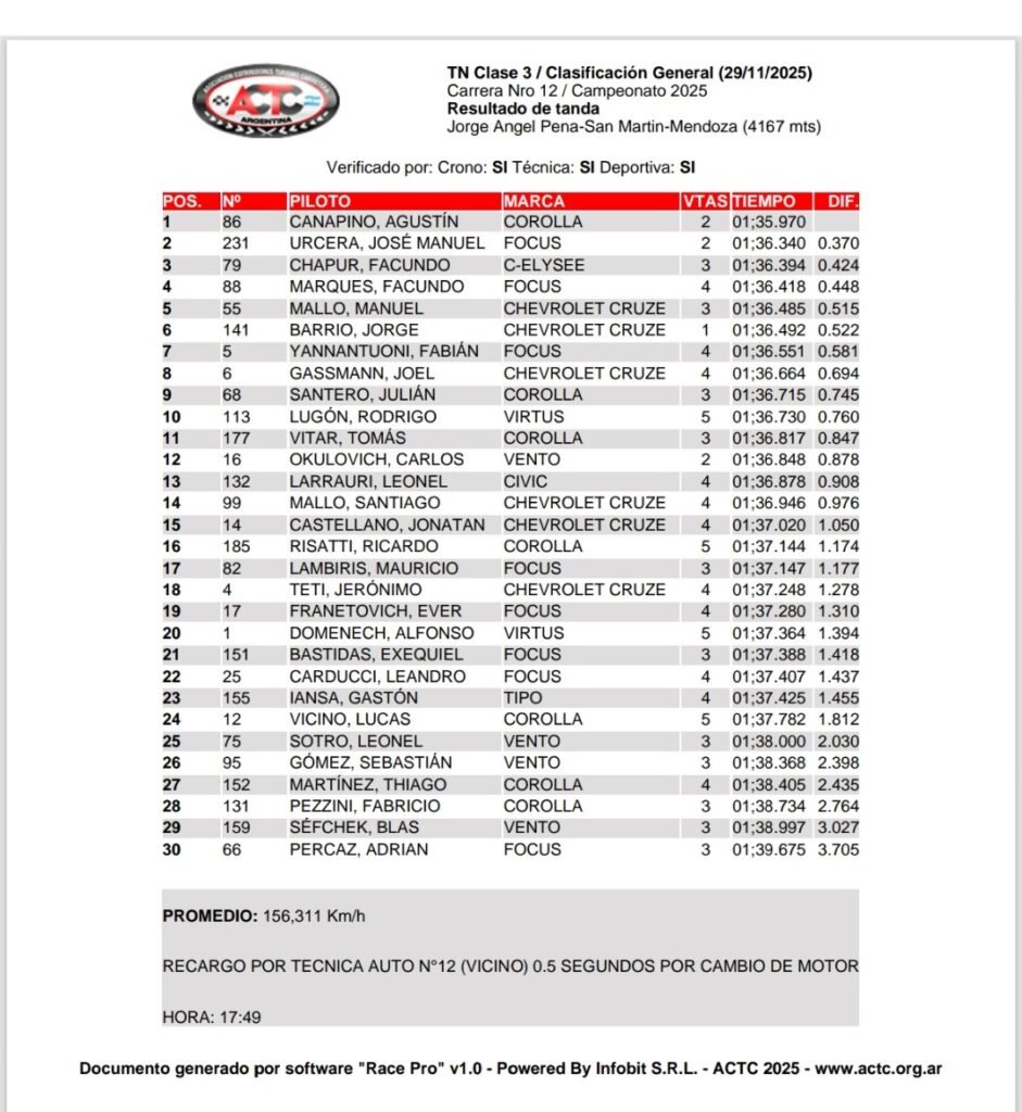 El piloto del Ale Bucci Racing, que viene de lograr la “pole position” en Río Cuarto, donde sin embargo fue excluido por técnica luego de culminar 2º en la Final, detuvo el cronómetro en 1m35s970 para su mejor vuelta y superó a José Manuel Urcera (Ford Focus), que clasificó 2º en su despedida del Larrauri Racing, por 0s370. Facundo Chapur (Citroën C-Elysée), otro bicampeón de la Clase 3 como “Manu”, se ubicó 3º a 0s424 del “poleman”.