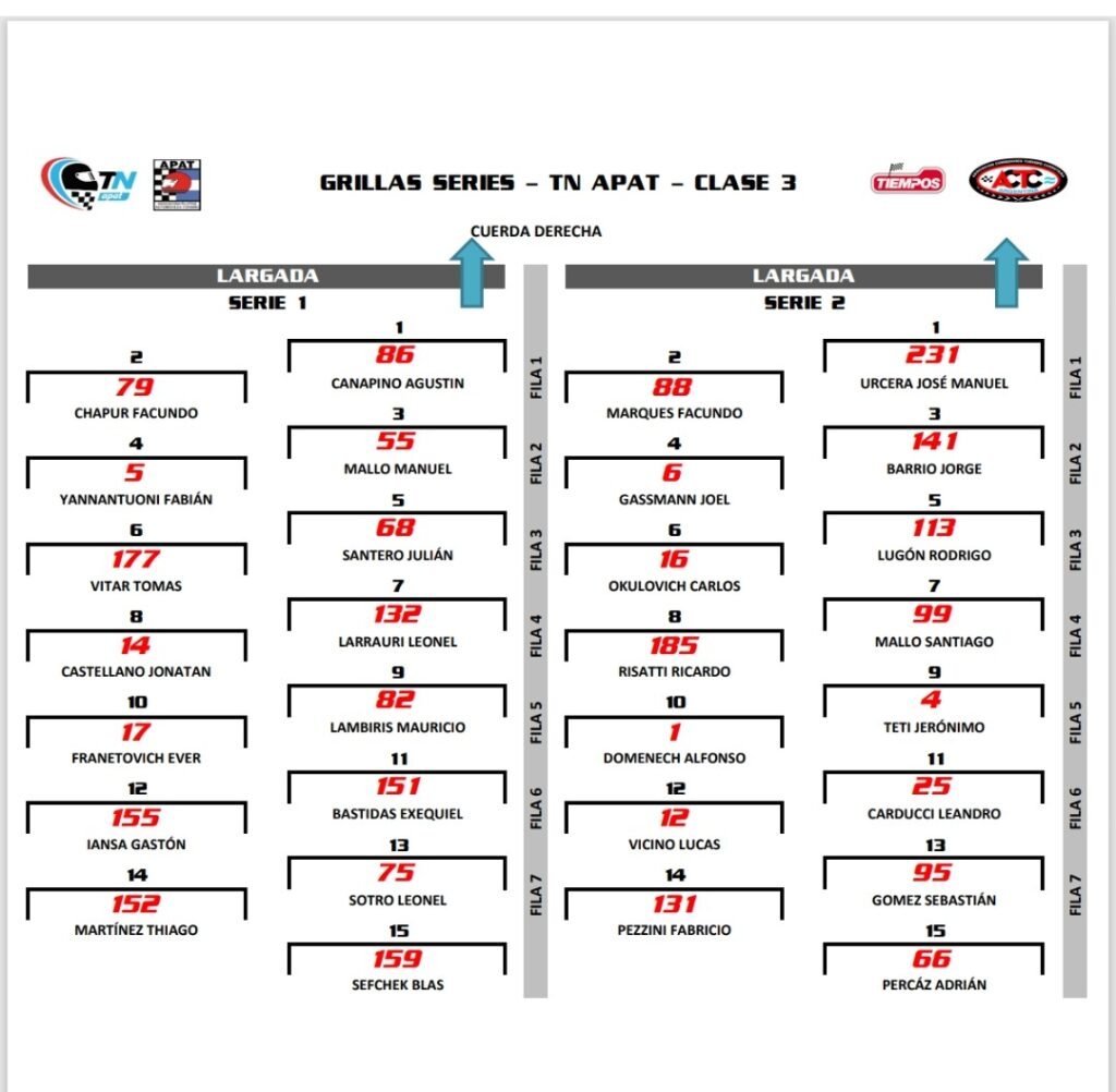 Mañana se disputarán las series en San Martín. Por 3ª vez en la temporada 2025, serán 2 parciales y no 3, como ocurre habitualmente, porque no se superaron los 30 autos, algo que ya había sucedido en Termas de Río Hondo y en Oberá. La 1ª se largará a las 10:10, con Agustín Canapino (Toyota Corolla) y Facundo Chapur (Citroën C-Elysée) en la 1ª fila, mientras que José Manuel Urcera (Ford Focus) y Facundo Marques (Ford Focus) partirán adelante en la 2ª batería, que comenzará a las 10:40.