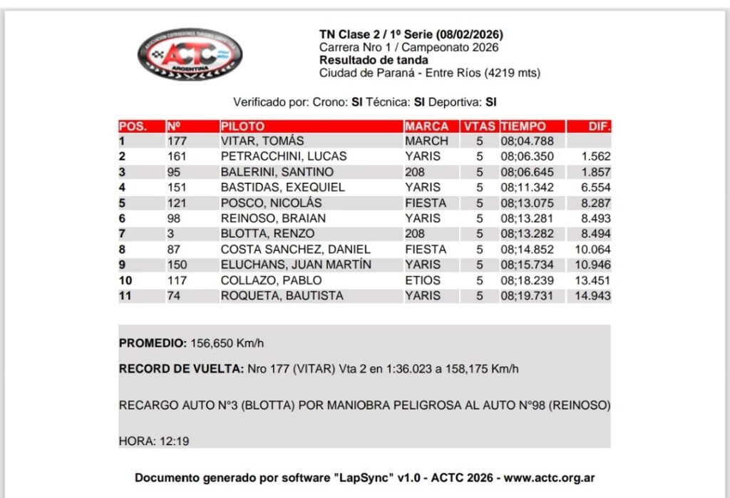 Tomas Vitar venció en la primera serie que disputó el TN Clase 2 en el Autódromo Ciudad de Paraná (Entre Ríos), donde hoy se conocerá al ganador del Gran Premio Club De Volantes Entrerrianos – Copa Pilay válido por la primera fecha del Campeonato 2026.