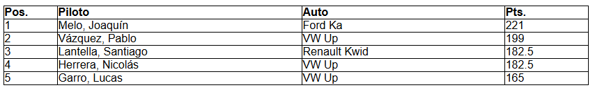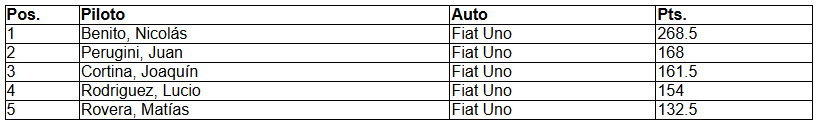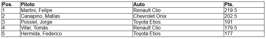 Con su cuarta victoria del año, Nicolás Benito se afirma como gran candidato al título. El piloto de Olavarría suma 268,5 puntos y estira su diferencia a 100,5 unidades sobre Juan Peruggini, quien es el escolta con 168. En tanto, Joaquín Cortina marcha tercero con 161,5. En la próxima fecha, el olavarriense podría consagrarse campeón de lograr una combinación de resultados.