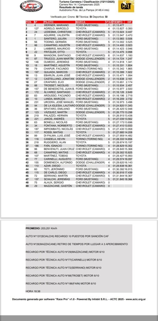 En consecuencia, Werner, con su Ford Mustang y al final de la jornada certificó lo que había logrado un par de horas antes, ser el piloto más rápido a la hora de la clasificación general y largar desde el mejor lugar en la grilla de partida de la primera serie que el TC completará este domingo por la 14ª. y anteúltima fecha del certamen 2025 de la categoría.