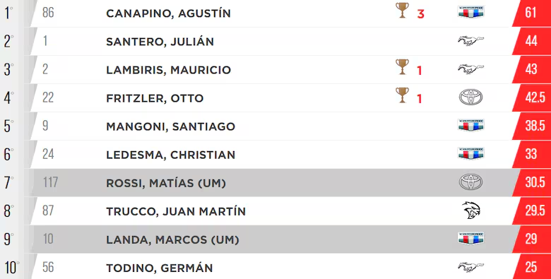 Con su tercer triunfo en lo que va de la temporada, el piloto que en los últimos años corrió en Indycar llegó a los 303.5 puntos en la tabla de posiciones y supera por 17 a Santero. En la clasificación general, quien ocupa el tercer lugar es Mauricio Lambiris (Ford Mustang), que tras quedar cuarto este fin de semana alcanzó la línea de las 281,5 unidades y superó por medio punto a Juan Martín Trucco (Dodge Challenger), quien fue décimo.