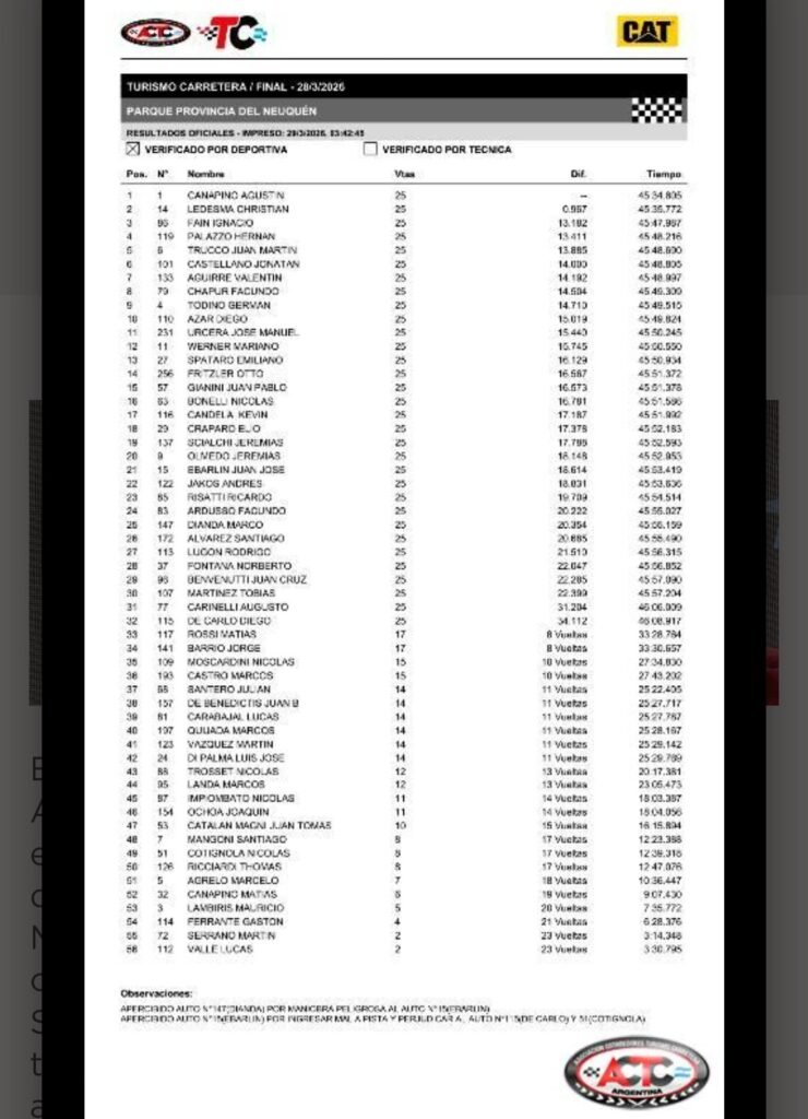 Agustín se repuso tras un mal arranque del 2026 en el TC, tras abandonar en El Calafate y Viedma. Con la final de hoy, en la que largó 5°, vuelve a la victoria y se recompone para la próxima fecha en Concepción del Uruguay y lo que resta del calendario.