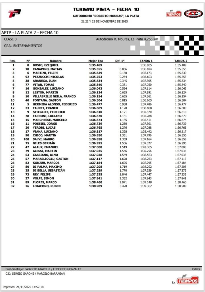 Ezequiel Bosio y el Toyota Etios del Robledo Competición prevalecieron en los entrenamientos de la Clase Tres del Turismo Pista en el Gran Premio Nave Motors, competencia que es válida por la décima y última fecha de la temporada 2025 y se disputa en el autódromo de La Plata. Matías Canapino y Felipe Martini fueron los escoltas.