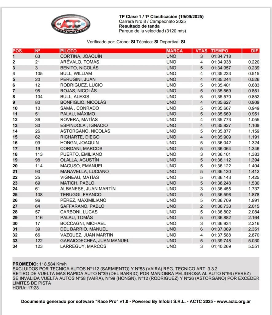Joaquín Cortina y el Fiat Uno que atienda su estructura familiar se impusieron en la primera clasificación de la Clase Uno del Turismo en el Gran Premio Avanzar, Copa A&L Distribuidora, que se desarrolla en el autódromo de San Jorge y es válido por la octava fecha de la temporada 2025. Tomás Arévalo y Nicolás Benito concluyeron como los escoltas.