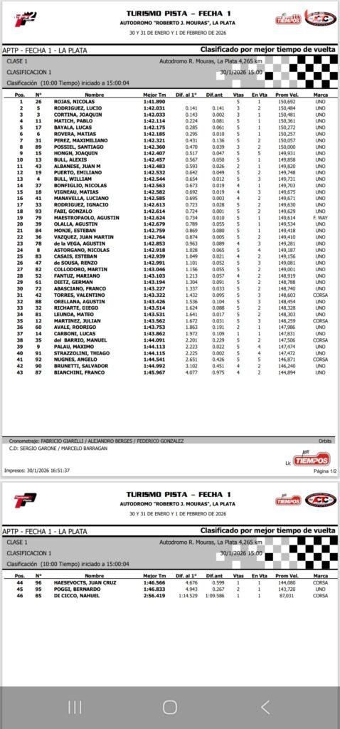 Nicolás Rojas y el Fiat Uno que alista el Fiornovelli Sport Group fueron los más veloces de la primera clasificación de la Clase Uno del Turismo Pista en el autódromo de La Plata, escenario de la primera fecha de la temporada 2026. Lucio Rodríguez y Joaquín Cortina terminaron como los escoltas.