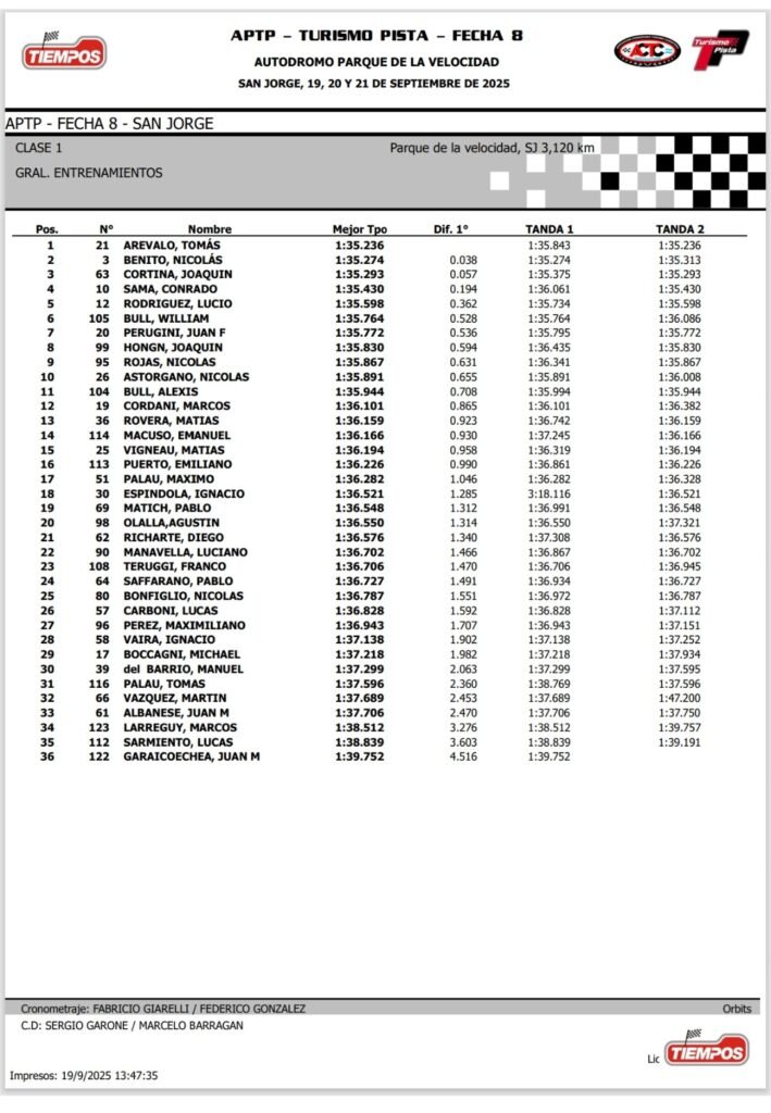 Tomás Arévalo y el Fiat Uno que alista el equipo de Roberto Pico dominaron los entrenamientos de la Clase Uno del Turismo en el Gran Premio Avanzar, Copa A&L Distribuidora, que se disputa en el autódromo de San Jorge y corresponde a la octava fecha de la temporada 2025. Nicolás Benito y Joaquín Cortina terminaron como los escoltas.