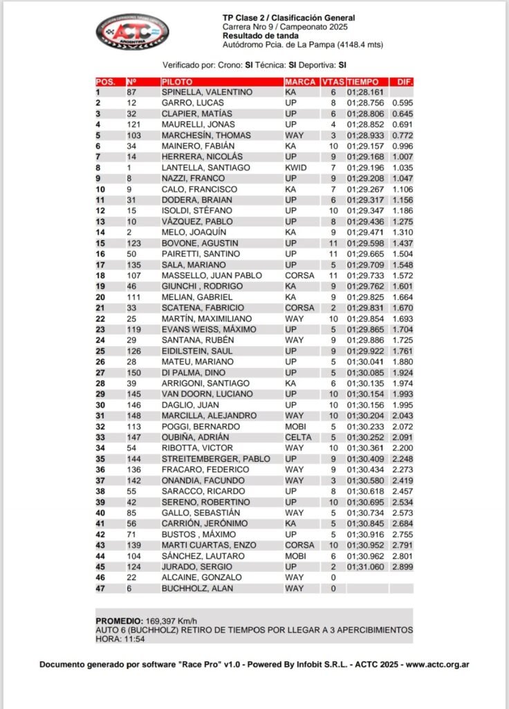 Valentino Spinella y el Ford Ka del Spinella Racing prevalecieron en la clasificación general de la Clase Dos del Turismo Pista en el Gran Premio Fric-Rot, el cual se desarrolla este fin de semana en el autódromo de La Pampa y corresponde a la novena fecha de la temporada 2025. Lucas Garro y Matías Clapier concluyeron como los escoltas.