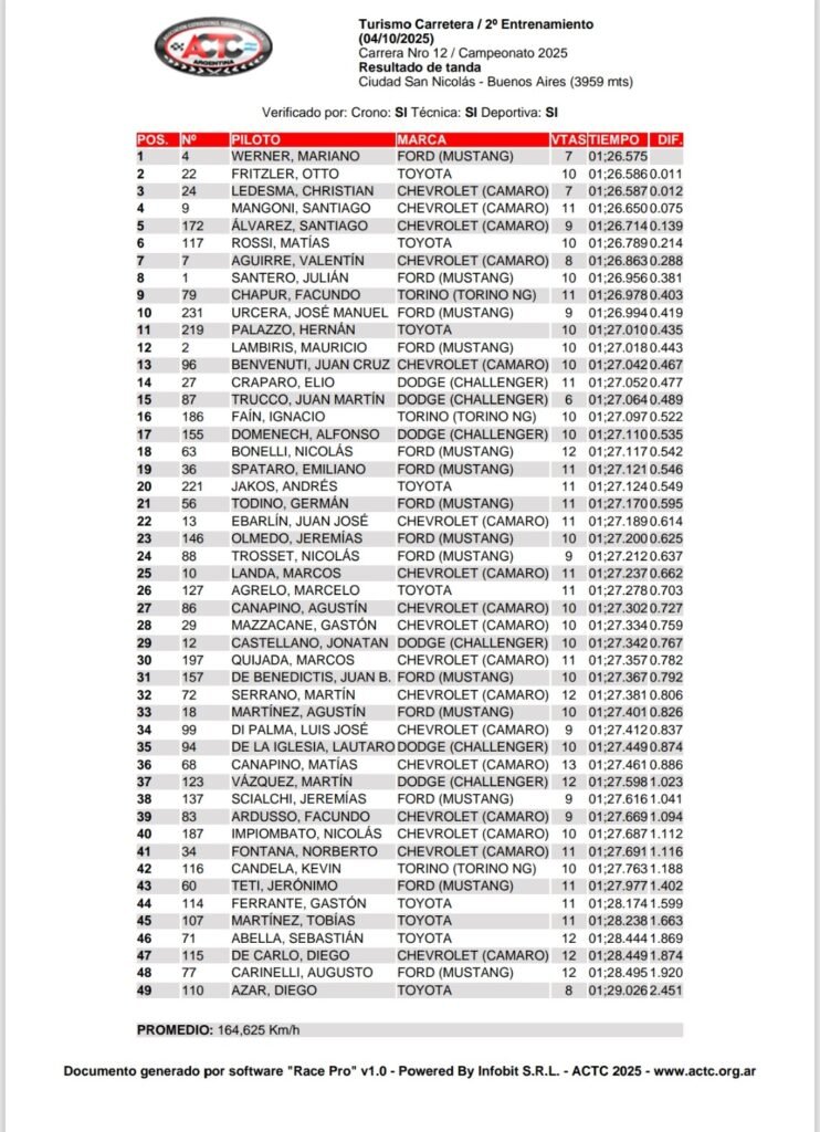 Mariano Werner, con el Ford Mustang del Fadel Werner Competición marcó un tiempo de: 1.26.575/1000 para recorrer los 3, 959 kms. del circuito Juan María Traverso del autódromo “San Nicolás Ciudad” ubicado en la ciudad de San Nicolas, Pcia. de Buenos Aires.