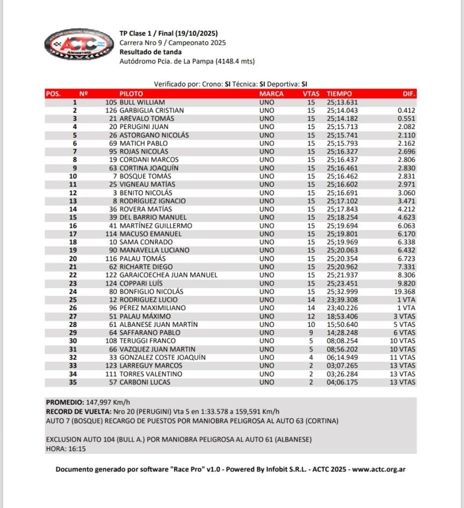 Luego de la carrera, los Comisarios Deportivos analizaron distintas situaciones y determinaron el recargo de Bosque por maniobra peligrosa a Cortina. De esta manera, Rojas, Cordani y el crédito de Otamendi subieron un puesto en el clasficador, mientras que el oriundo de El Triunfo cayó al décimo lugar.