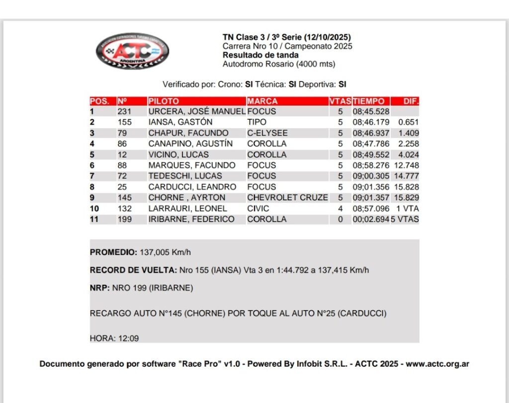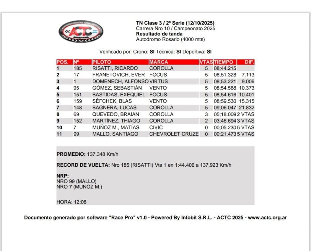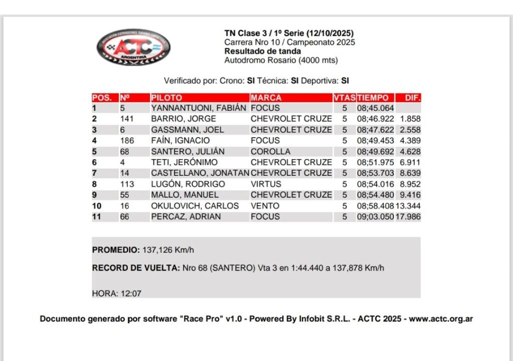 Yannantuoni, Risatti y Urcera ganaron las series de la clase mayor del TN APAT en el autódromo de Rosario.